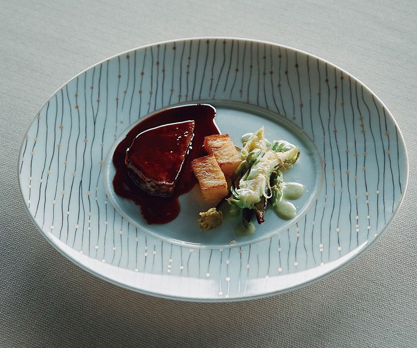この日のメインは、なかやま黒牛のサーロイン。添えたのは、屋久島産ドラゴンフルーツのつぼみのソテーだ。豊富なワインリストも魅力。