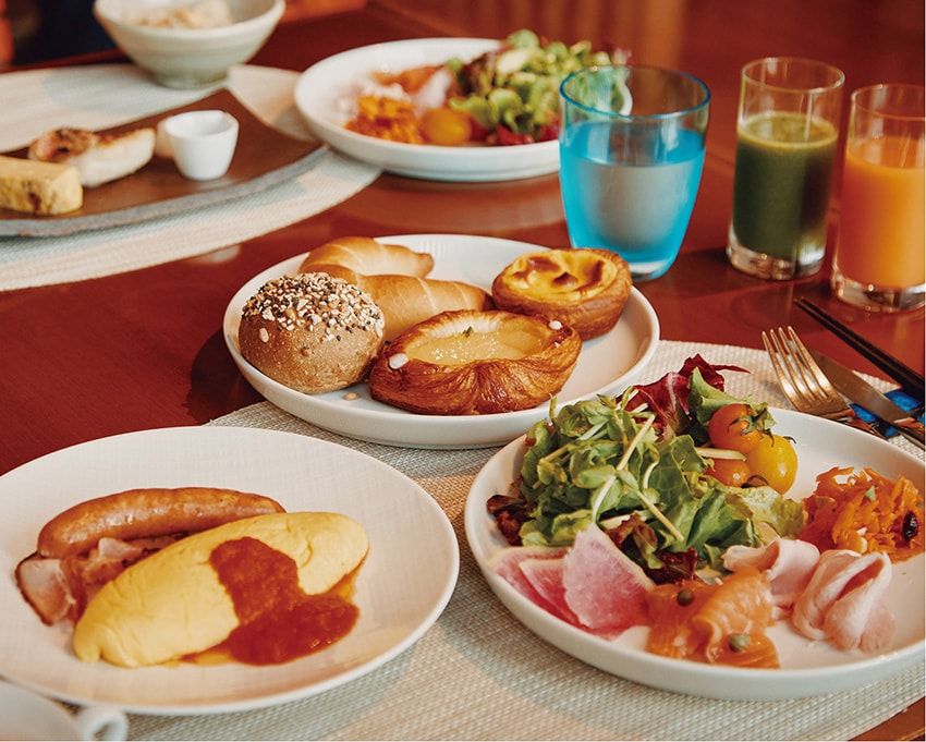 1階の「アヤナ」は朝食のブッフェ会場にも。職人が毎朝焼くパンが美味。地場のサラダや和食など、魅力的な選択肢が多くてつい迷ってしまう。それもまた、贅沢な悩みである。