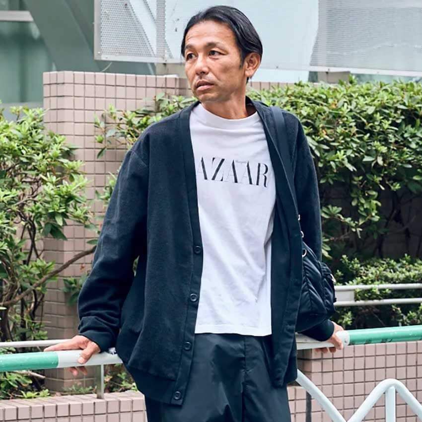 ▶古牧さんのスナップをすべて見る古牧賢一さん(48歳)元祖使える系羽織りモノは、羽織らなくても調子いい。ヘアを含めたグレーグラデーションがサマになる小牧さんは、名門“スメドレー”のファインゲージニットをサッと肩掛けした。