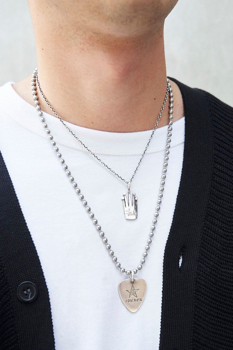 カーディガン=バトナー Tシャツ=コンビニエンスウェア×トリップスター パンツ=プロップスストア シューズ=コンバース 眼鏡=ジュリアスタートオプティカル 腕時計=シチズン ネックレス=クロムハーツ ネックレス2=ステューシー ブレスレット=ティファニー リング=トムウッド