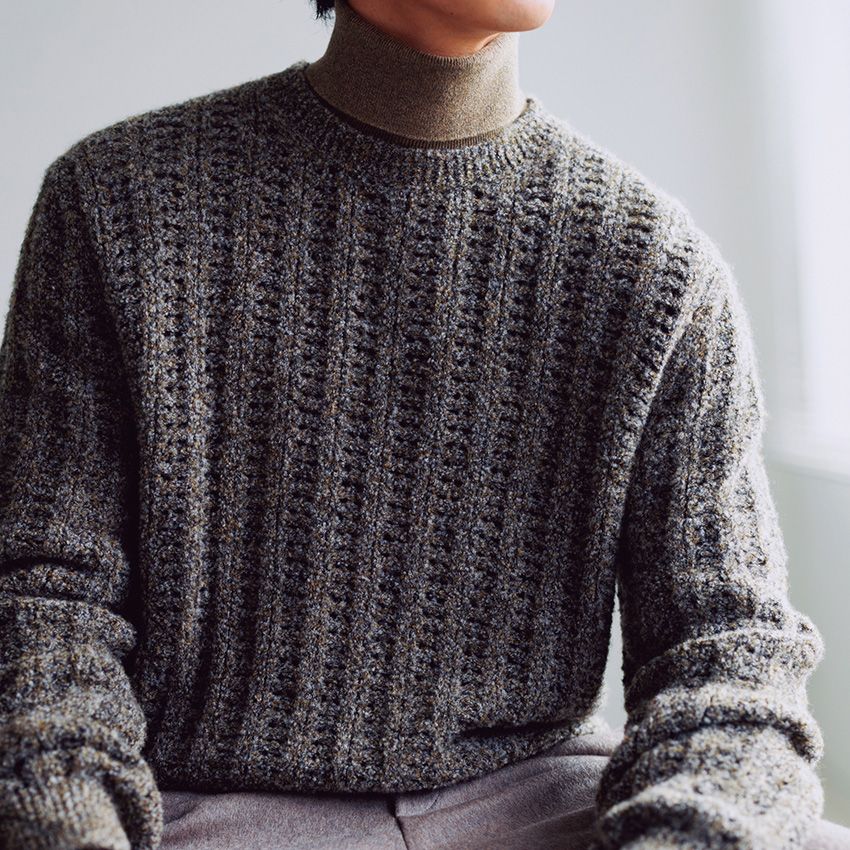 カシミヤ66%、シルク34%の上質な混紡が生む、軽やかな着心地。異なる色のブークレ糸を用いながら、柄をを作るようにして編まれた立体的な表情が、秋冬のムードをしなやかに引き立てる。