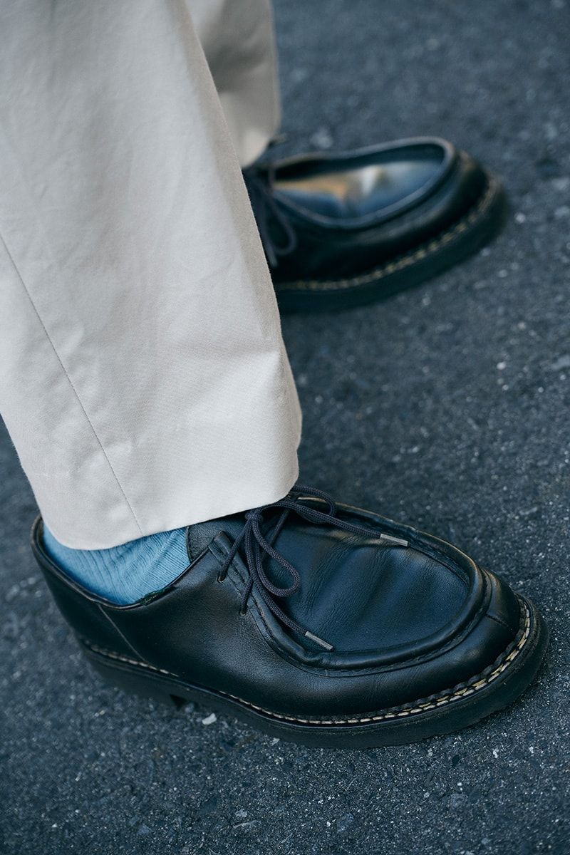ニットと白Tで作るヌケ感のある上品レイヤーは、ややショート丈のジャケットと上手にマッチング。カラーソックスでさり気なくハズす塩梅もグッド。洒落てる!