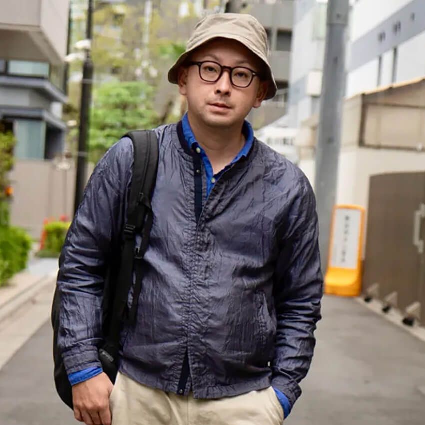 ▶︎千崎さんのスナップをすべて見る千崎淳平さん(38歳)艶感のあるネイビーのナイロンブルゾンを主役に、インナーは「サンスペル」のブルーシャツを選択。ベージュのワイドチノを合わせることで、大人っぽさとともにリラックス感を演出している。
