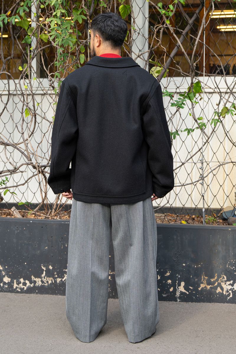 「ルメール」の黒いウールジャケットに、グレーのワイドパンツを合わせた大人のモノトーン。インナーの赤ニットとロゴ入りスウェットが、遊び心と季節感を兼ね備えている。