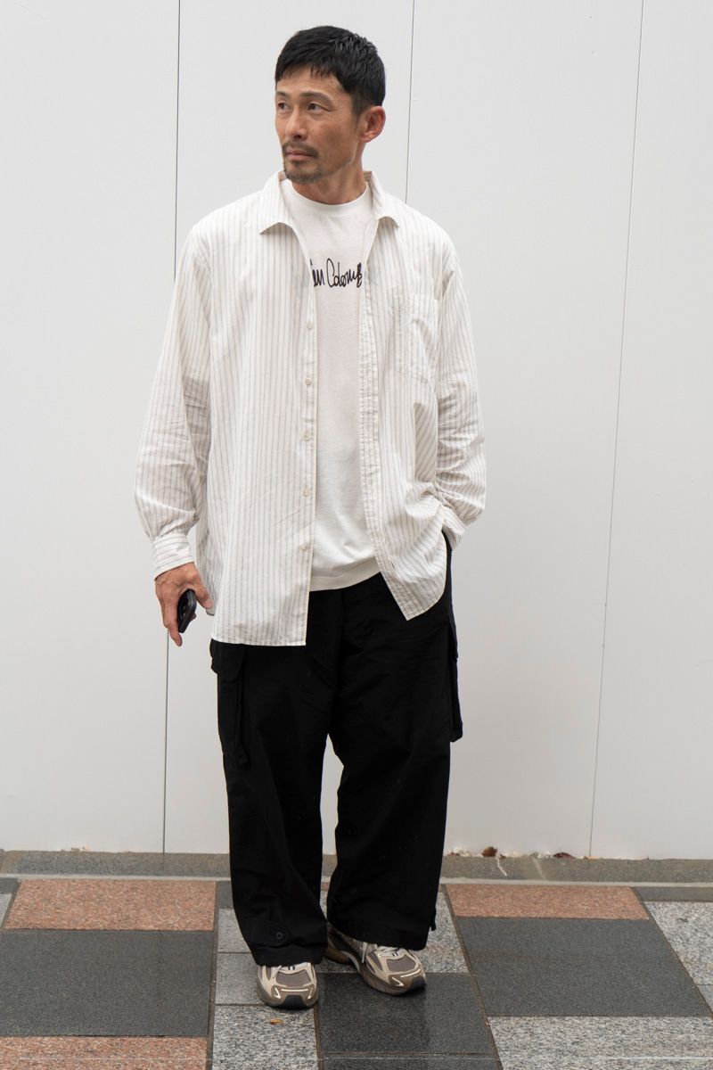 ▶︎中島さんのスナップをすべて見る中島 良さん(44歳)スポーティなシャカシャカ系カーゴパンツ。しかも黒。この時点で相当に街仕様へと傾いたデザインながら、ストライプシャツと合わせることでシュッとした印象がより強固になる。