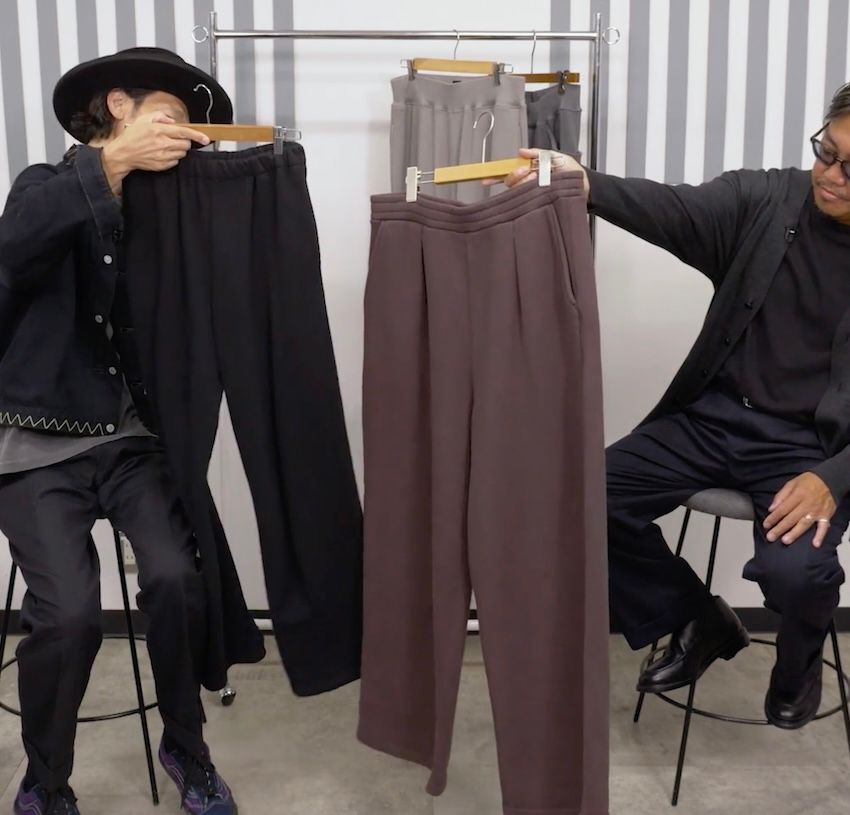 ハラ 今回は2本試着してみたけど、いかがだったでしょうか? 裾のリブがない、いわゆるトラウザーズとかチノパンをスウェット素材で作ってるだけぐらいの感じで選ぶといいかなと思います。