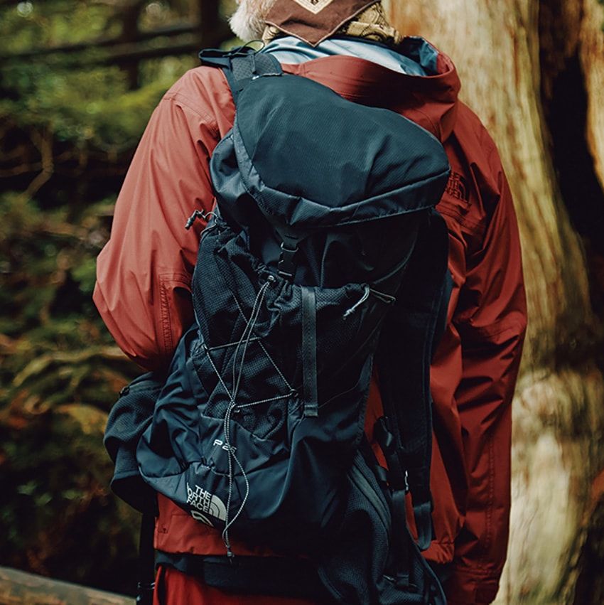 「ウェアと同じ“ノース”のバッグはサミットシリーズのもの。水や救急キットなど最低限のギアを携帯」。ほかの小物と同様に黒で揃え、統一感を意識した。