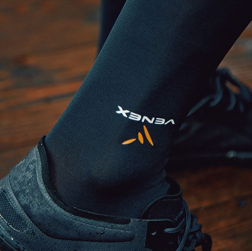 ロゴの上下反転が物語るとおり、アームカバーをソックスに転用。「既成のソックスだと、丁度いい長さが見つからなくて。実際、何の問題もなく気持ちいい」。