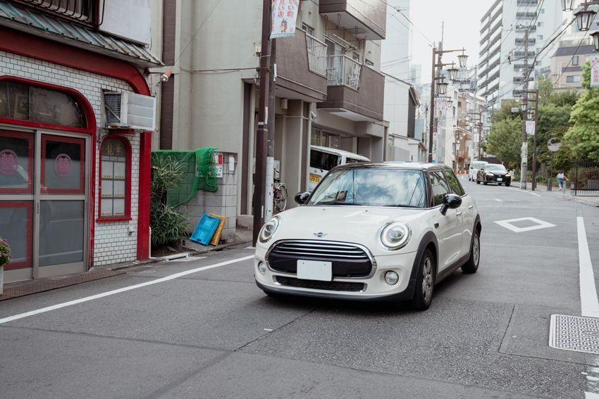 午後の柔らかな光が射し込む、三軒茶屋の路地裏。白い「ミニ クーパー」が、ゆっくりと街を抜けていく。コンパクトで丸みのあるフォルムがなんとも愛らしい。