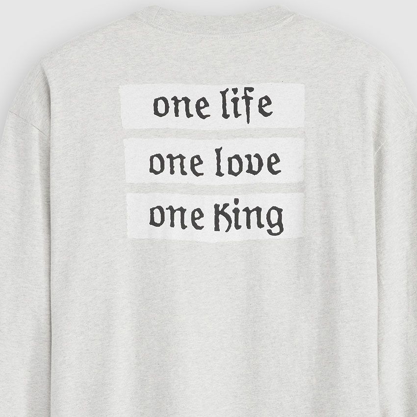 まず目を引くのは、Nasの生き方と哲学を体現したロンT。フロントにはシンプルに“Nas”の文字、バックには「one life/one love/one King」というメッセージを配した。音楽にも人生にも、真っ直ぐで誠実なNasのスピリットを宿す一枚だ。