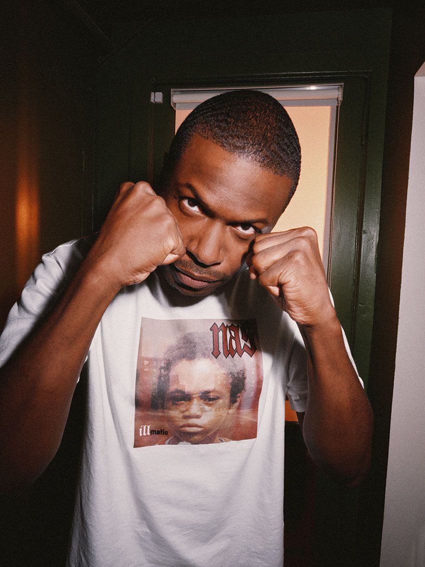 ホワイトのTシャツには『Illmatic』のアルバムジャケットを大胆にプリント。左右の袖にはそれぞれ、コラボの証として両者のロゴが刻まれている。