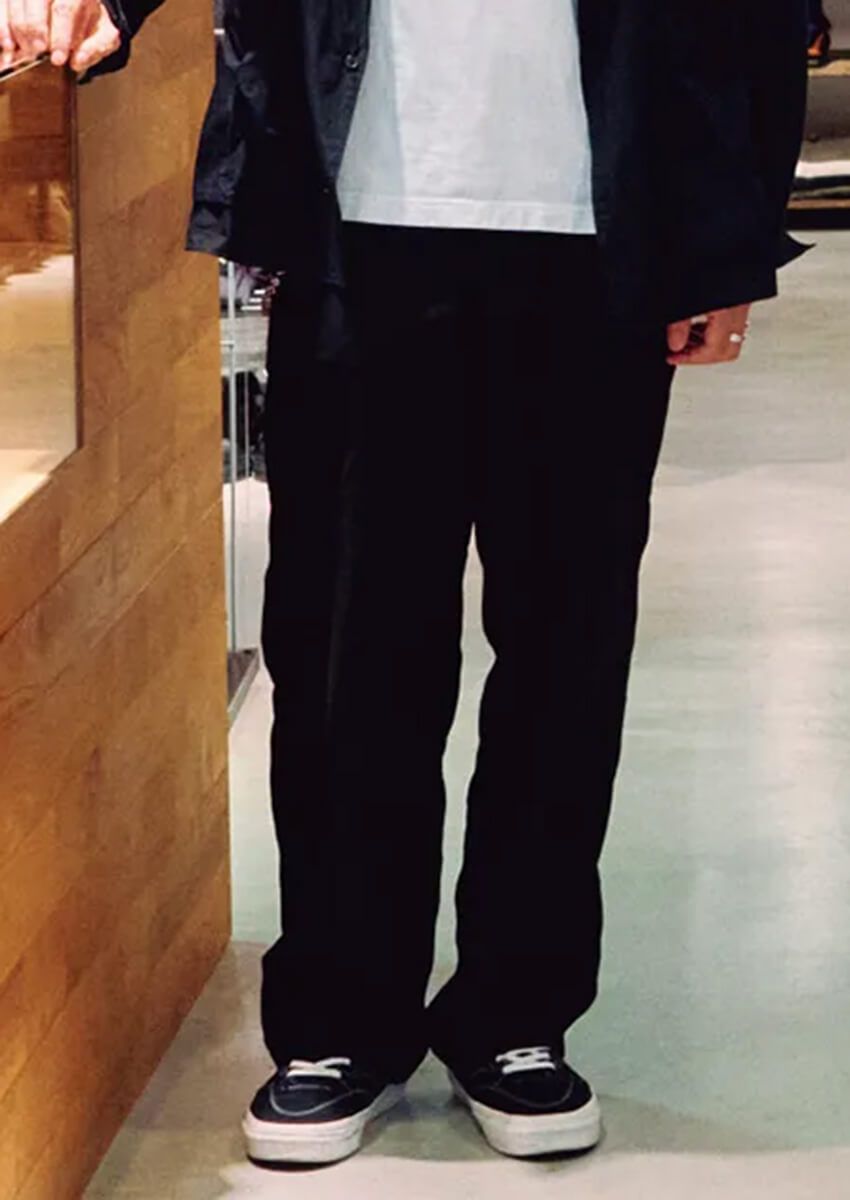 ▶︎ささおさんのスナップをすべて見るささおさん(26歳)日本が誇る職人の手仕事に魅了されたデザイナー松島紳さんによるブランド、カンタータのパンツは、ドレープが美しく出たワイドシルエットがアイキャッチ。