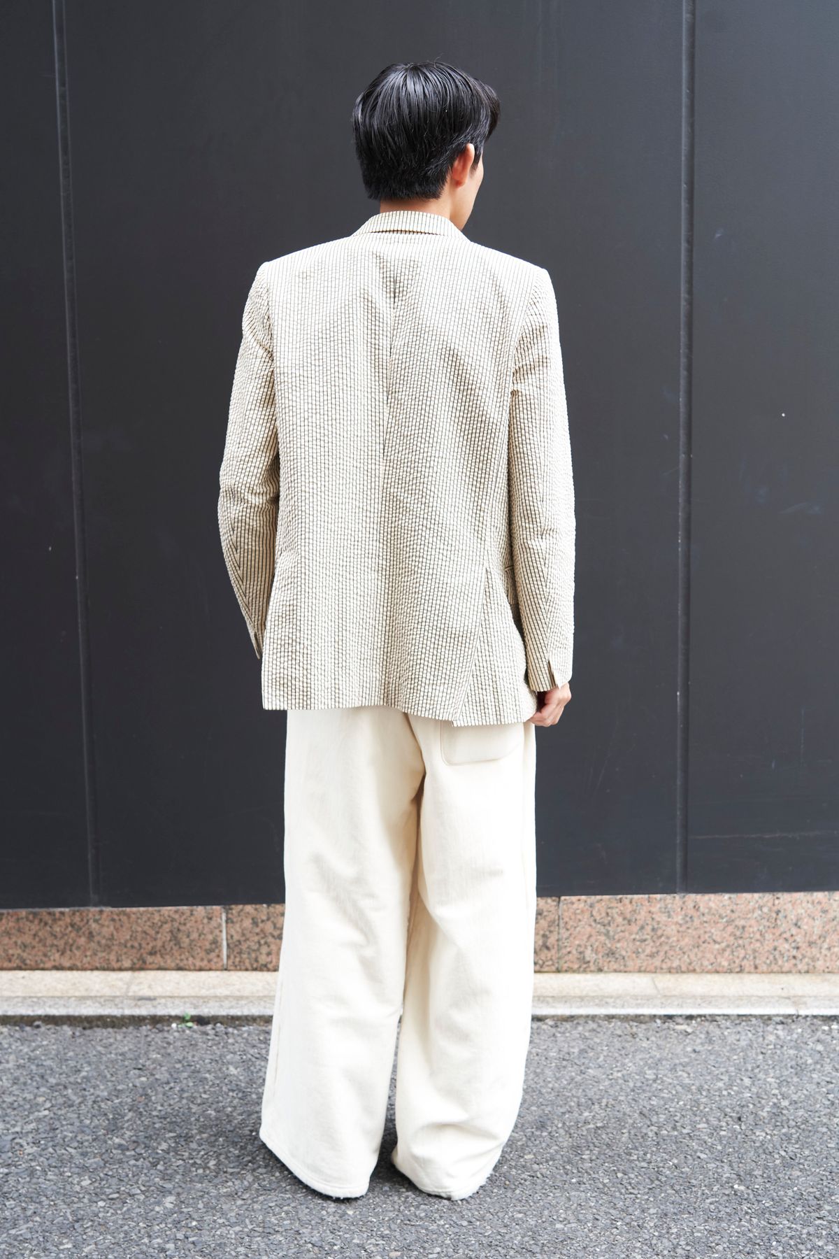 シアサッカーのジャケットは白ベースのストライプ、Tシャツはグレー、パンツはオールホワイト。全身優しい色選びにも関わらず、こんなに尖った雰囲気が出せるなんて!
