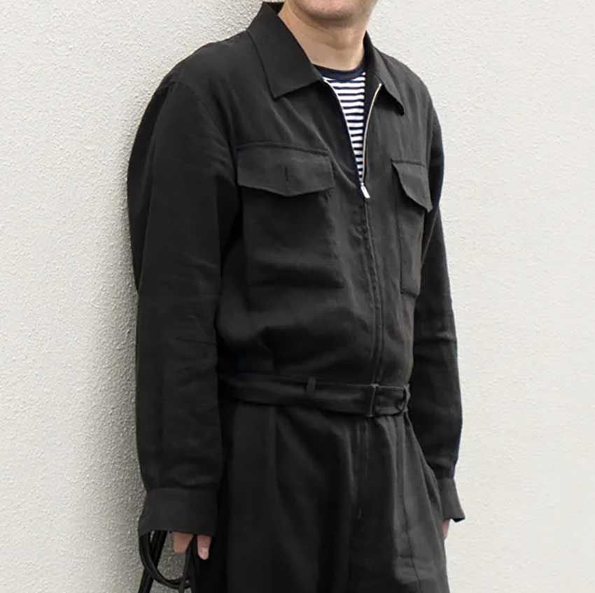 ▶マルさんのスナップをすべて見るマルさん(41歳)武骨でワイルド。そんなイメージの強いオールインワンを素直に着つつも、どこかお行儀良く見える。胸元でわずかに覗くストライプの、類稀な影響力を再確認できるはずだ。