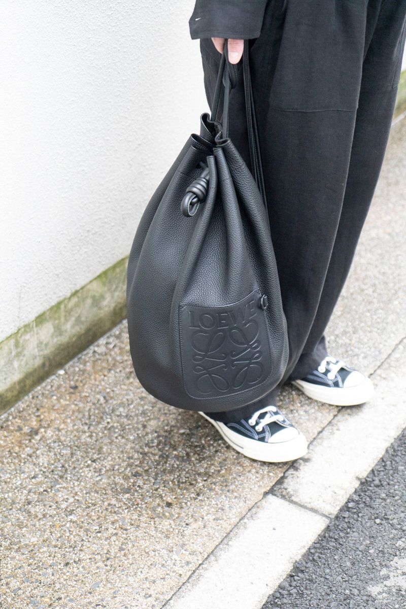 いい感じにユルい“つなぎ”のサイズ感、全身を黒でまとめながらキャップの優しい赤でギャップを作った点など、細かいテクニックも見逃し厳禁。ロエベのバッグも超洒落てる。