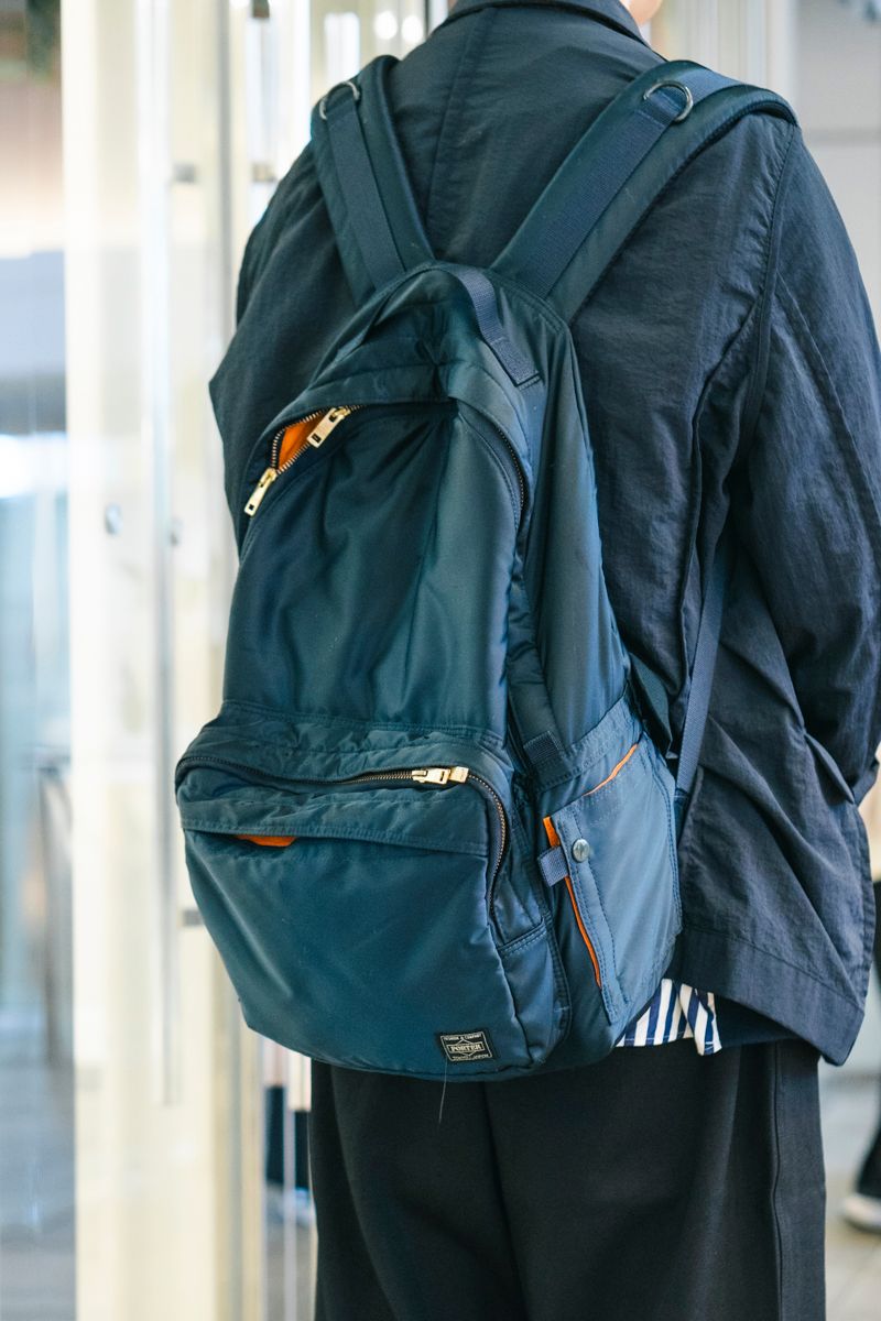 ジャケット、シャツ=ともにサカイ パンツ=グラミチ シューズ=ノースウェーブ 眼鏡=フォーナインズ バッグ=ポーター 腕時計=カシオ