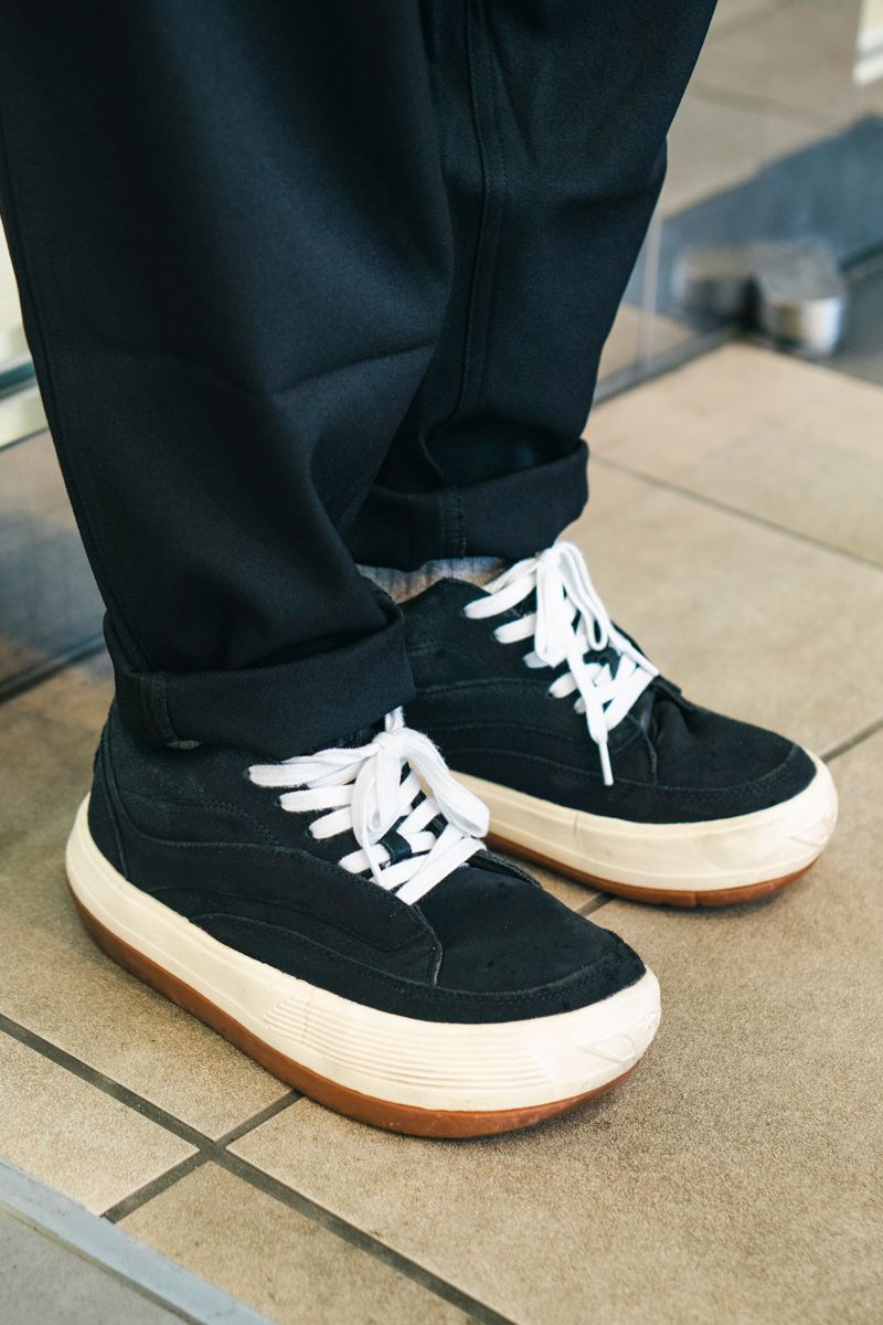 ややトーンを濃いめにハズしたグラミチのパンツは、裾をロールアップすることで軽さをキープ。同系色の厚底スニーカーとのバランスも良く、懐かしくも新しい。