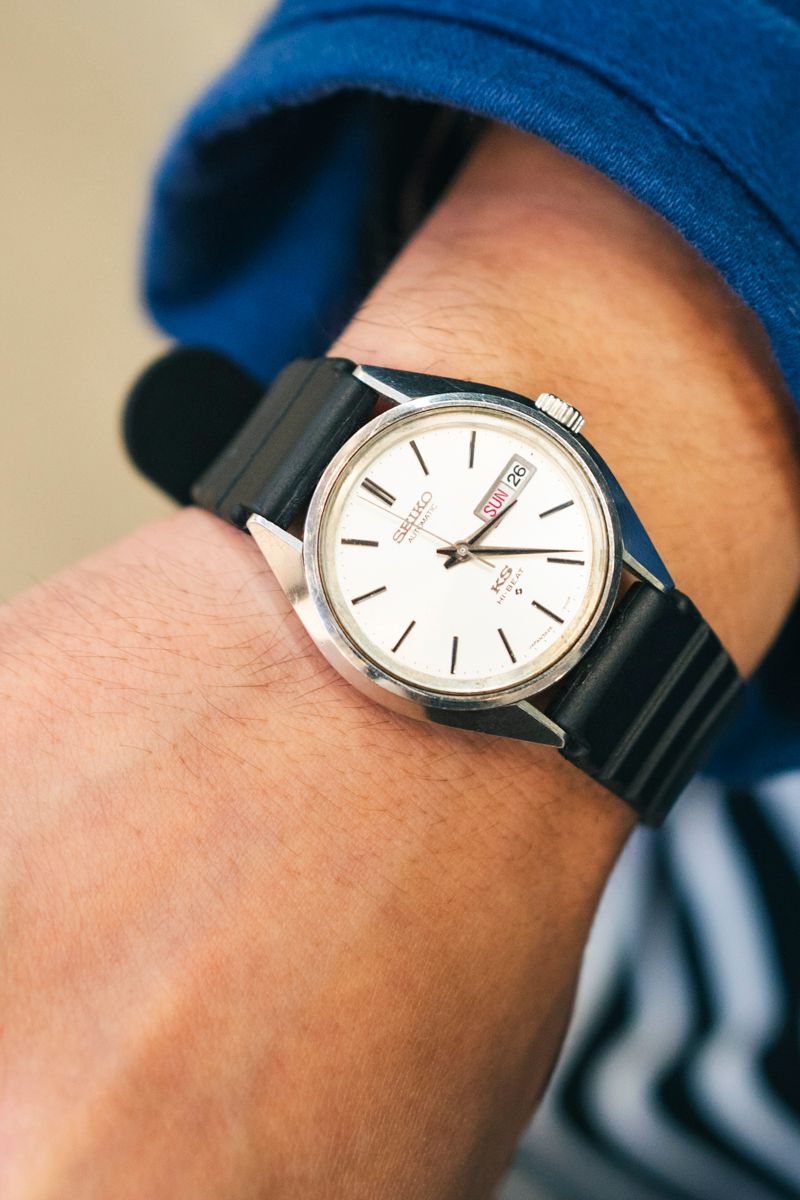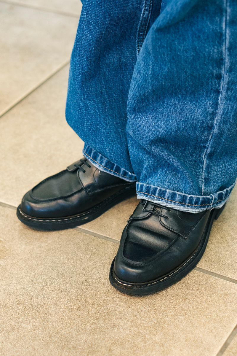 ▶石川さんのスナップをすべて見る石川博健さん(44歳)デニムを軸としたブルーの装いに、シックなブラックで落ち着きをプラス。モカシンシューズ、キングセイコー、そしてバスクシャツのストライプが共鳴する。