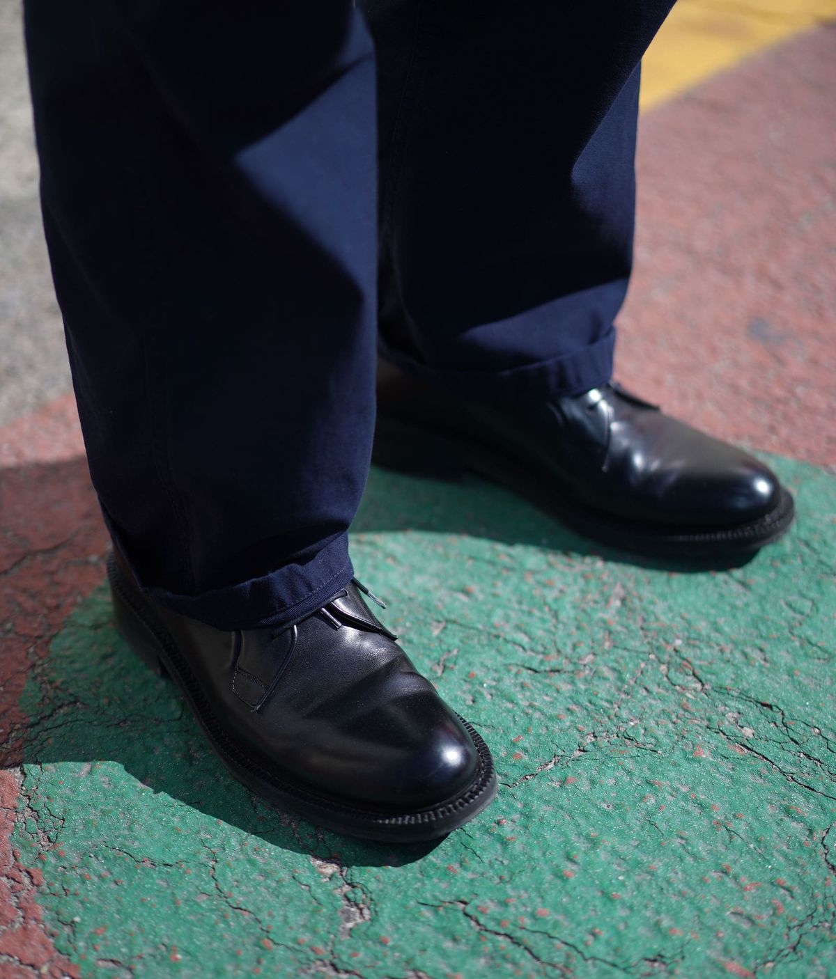 で、タックインしたインナーにはレトロな2色使いのブルーボーダーで彩られる。綺麗なシルエットのパンツには、ファティー具ポケットのディテールを効かせて。お上品!