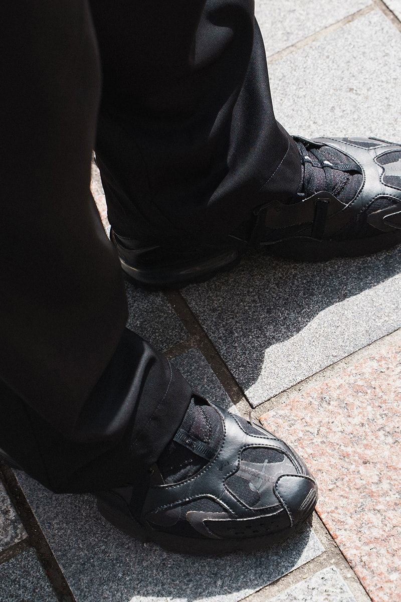 パンツもスニーカーもオールブラックで、インナーは清潔感のあるホワイト。大人カジュアルとはこういうこと。