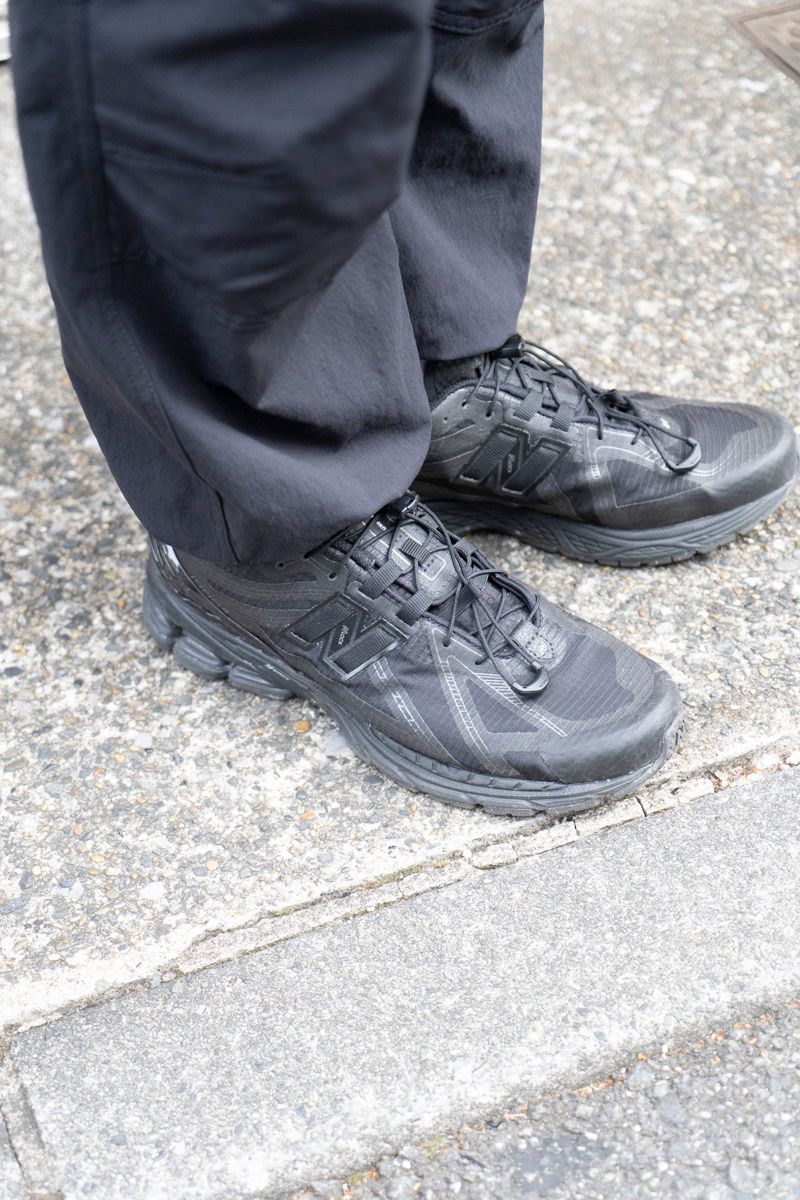 ▶︎伊藤さんのスナップをすべて見る伊藤 慧さん(30歳)オールブラックのワークパンツにロンT、そして機能的なバックパック。重くなりがちなブラックコーデを、クリアフレームのメガネとシルバーアクセで軽やかに仕上げている。ボトムスに選んだ機能的なナイキのパンツと、「1906R」が全体をシャープに引き締め、ストリートなワークスタイルを完成させている。