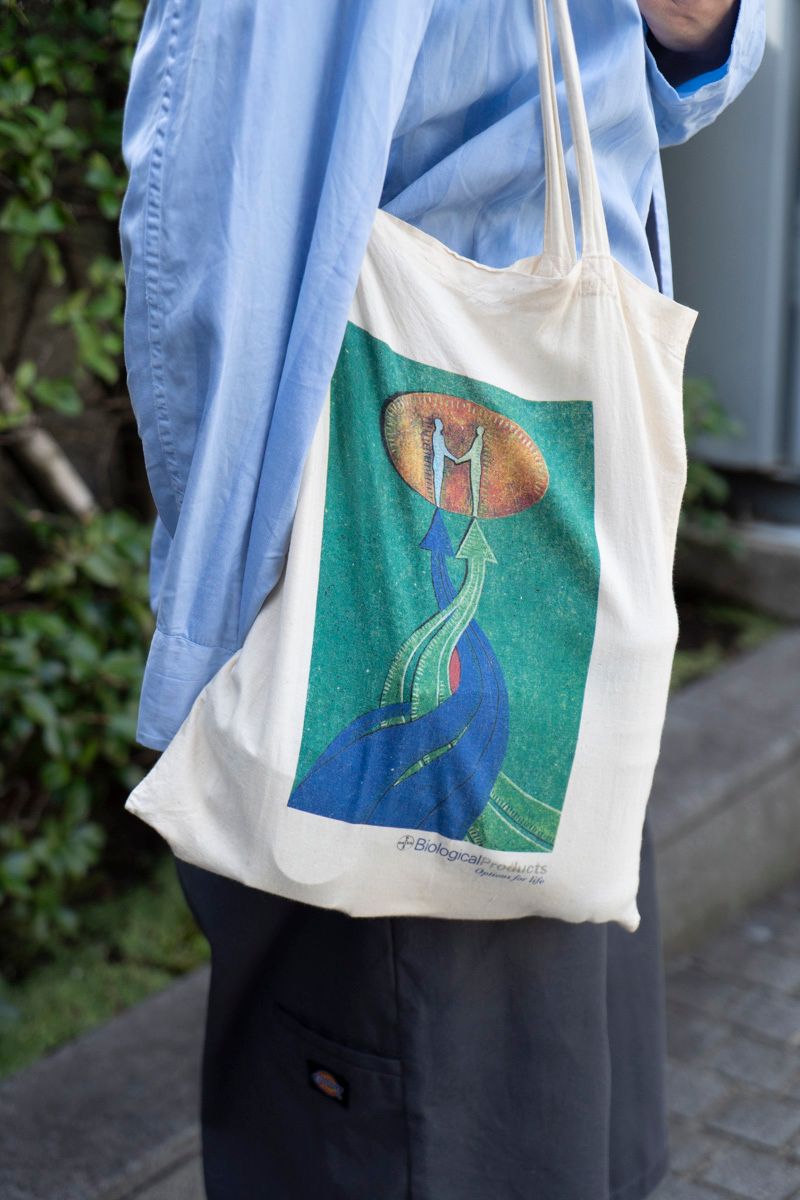 あえてロングブーツをハイソックスと合わせて肌見せの面積を狭めるなど、足元にも強烈かつ繊細な個性が。アイコニックなエコバッグにも注目。まさに、日常に潜むアート。