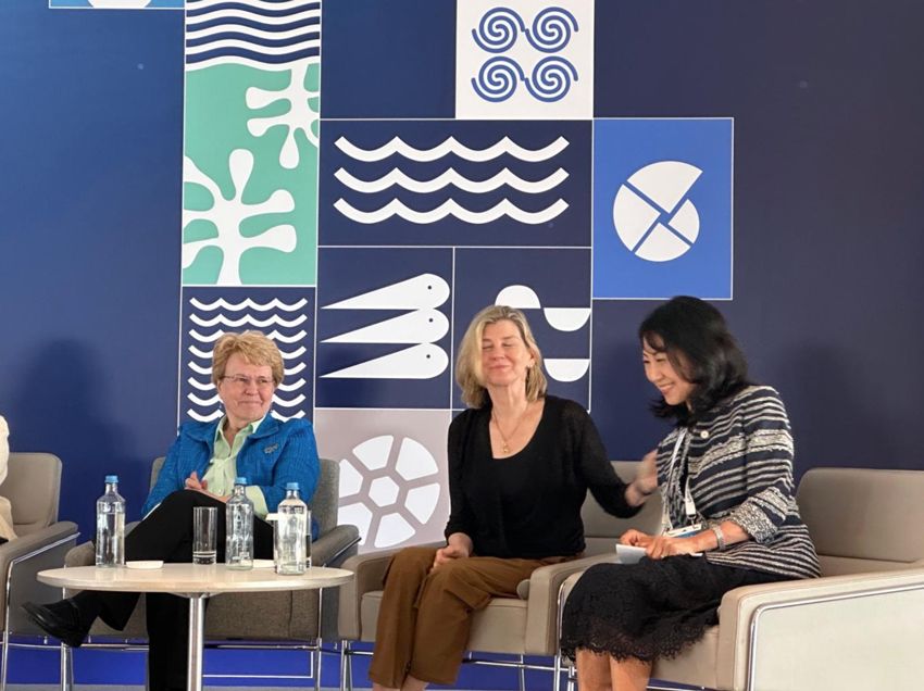 2024年4月にギリシャ・アテネで開催されたOur Ocean Conferenceの世界の海洋問題を担う女性リーダーたちのパネルの様子。井植さんとジェーンさんの間に座っているのはパッカード財団トップのナンシー・リンドバーグさん。ジェーンさんの左は元ポルトガル海洋大臣のアッスンサオ・クリスタスさん、写真一番左は元EU海洋担当大臣のマリア・ダマナキさん。