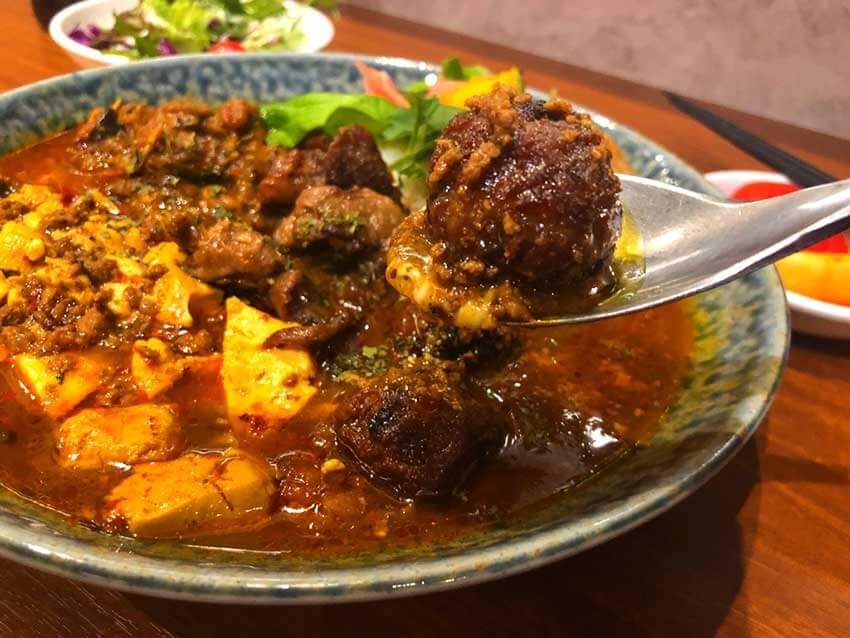 中華料理でおなじみ、羊×クミンのゴールデンコンビをカレーに落とし込んだ「ラムクミン炒めカリィ」も、美味しくないわけがない。「ラム肉団子」を煮込んだカレーもめちゃくちゃうまいんですよ! これこそ本式中華料理人の面目躍如、表面はカリッと香ばしく、中はほくほくジューシー。見つけたら絶対に頼んでください。