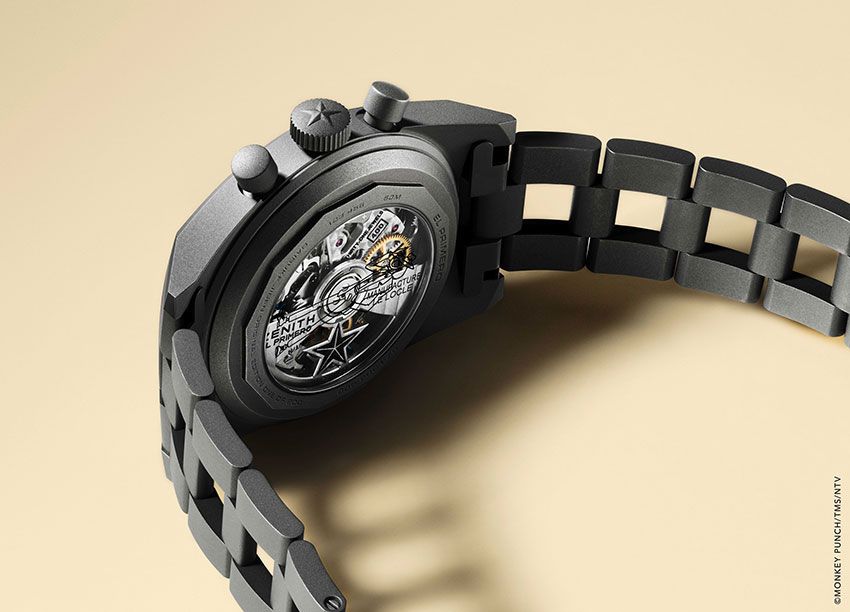 ムーブメントは、エル・プリメロの正統な系譜を継ぐキャリバー400を搭載。毎時3万6000振動(5Hz)の高振動と50時間パワーリザーブを備える名機で、300点以上から成る精密な構造はサファイアガラスの裏蓋から鑑賞できる。裏蓋には、シルエットだけで次元大介と分かるアイコニックな刻印も施されている。