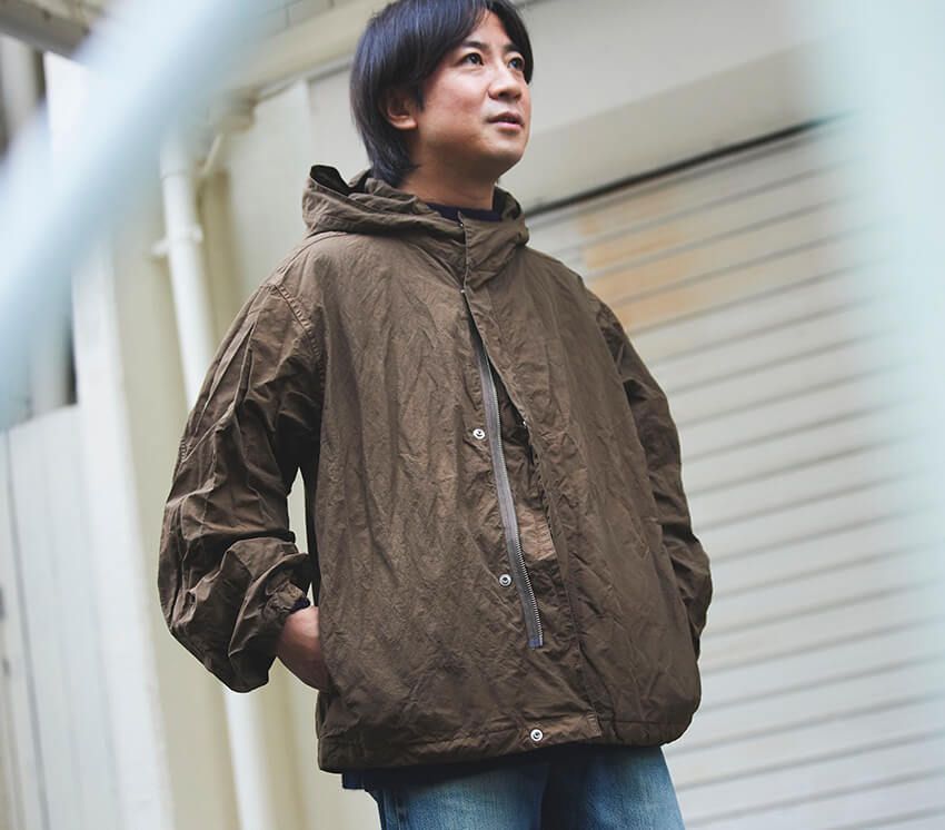 「後染めのアウターはカジュアルな雰囲気ですが、ブラウンの色味がシックでデニムとの相性もいい。エヌハリウッドでパタンナーを担ってきた方が独立して立ち上げたブランドで、シルエットや作りがすごく考えられているんですよ」。
