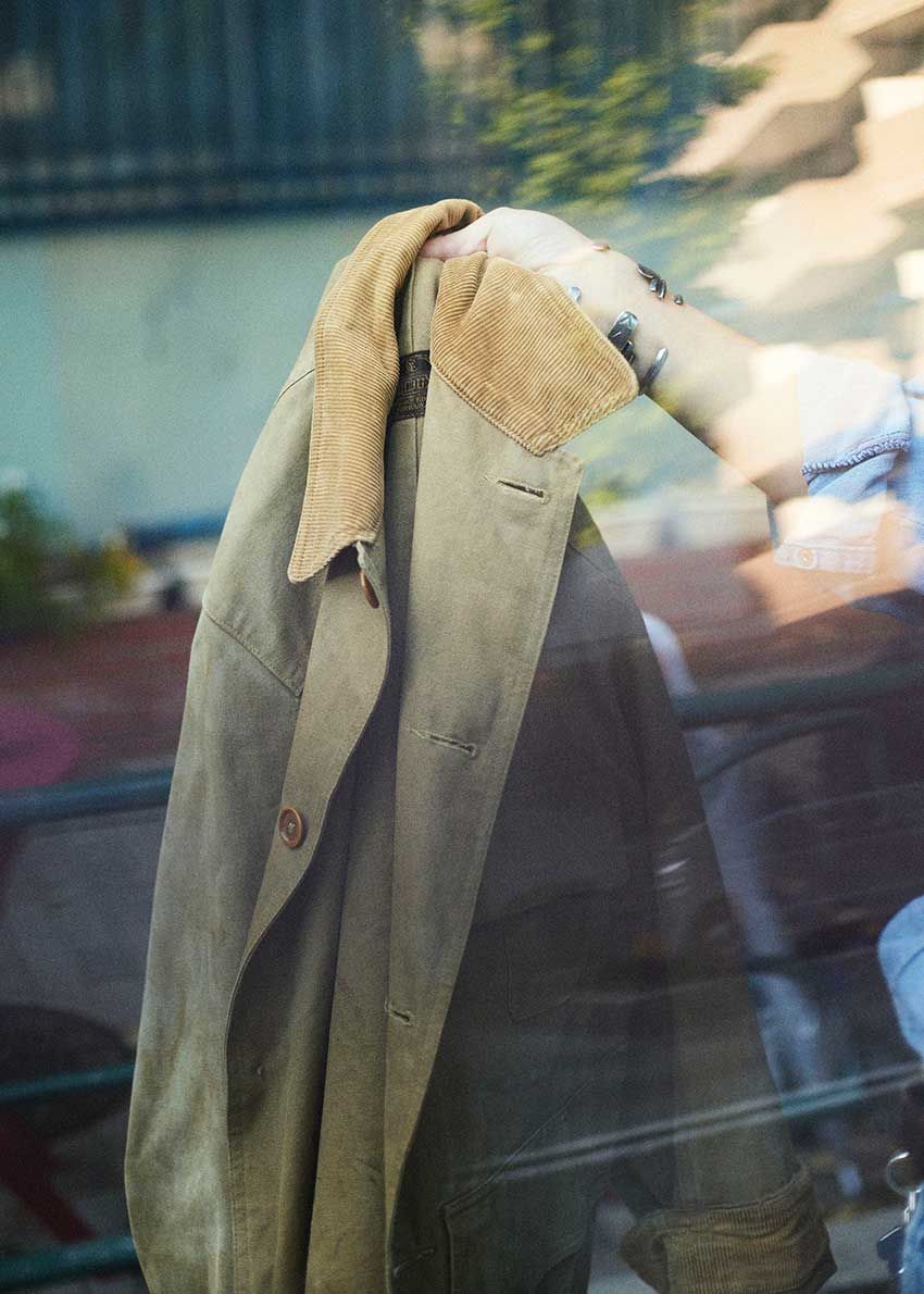 極め付けがアウター。こちらは1930年代のヴィンテージだ。背面の腰ポケットのあたりにうっすらと入ったシミは、実際、ハンティング時に捕まえたウサギや野鳥の血だという。