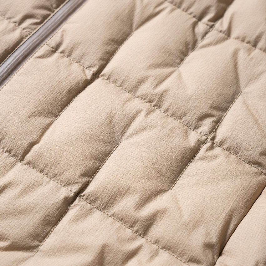 また、保温性を効率よくキープするため、独自のキルティングパターンでダウンが偏らないようにし、かつ縫い目を大幅に減らしています。デザインとして注目されることが多いのですが、あくまで機能性を追求した結果なんです。モンベルのモノづくりの理念は『Function is beauty=機能美』というものですから」。