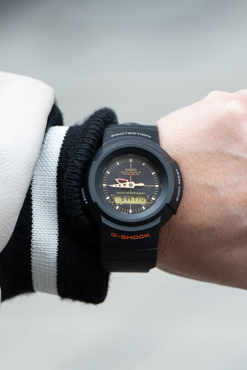 ブルゾン=エビセンスケートボード×デラックス スウェット=グリーン パンツ=ダイワ ピア39 シューズ=アディダス 腕時計=カシオ