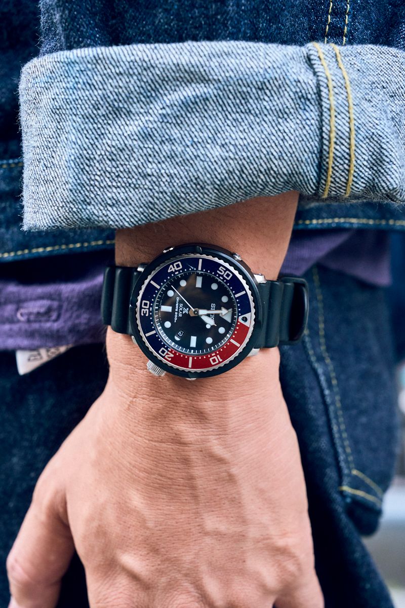 レッドウィングのブーツ、セイコーのダイバーズ、金子眼鏡の丸メガネなど、脇役のチョイスも硬軟織り交ぜて。紫のインナーでつなぐ感覚も、バランス良好!