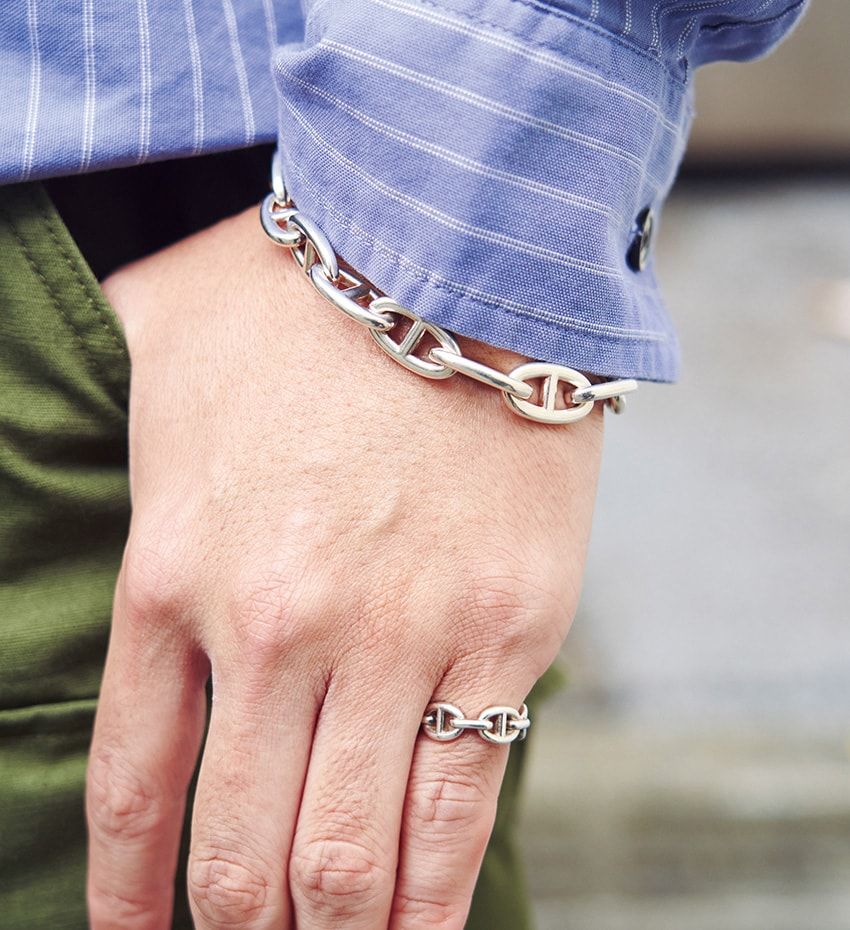 てっぺいさん / 46歳シャツ、パンツ、キャップはいずれもステューシー。そこにエルメスの名品「シェーヌ・ダンクル」を、ブレスレットとリングで忍ばせたのが見事だ。