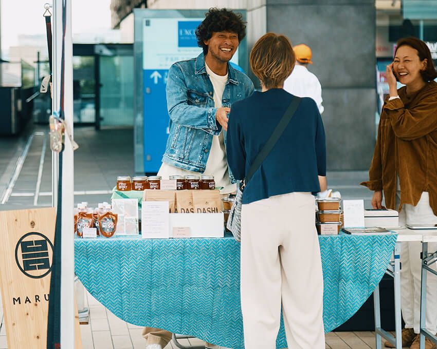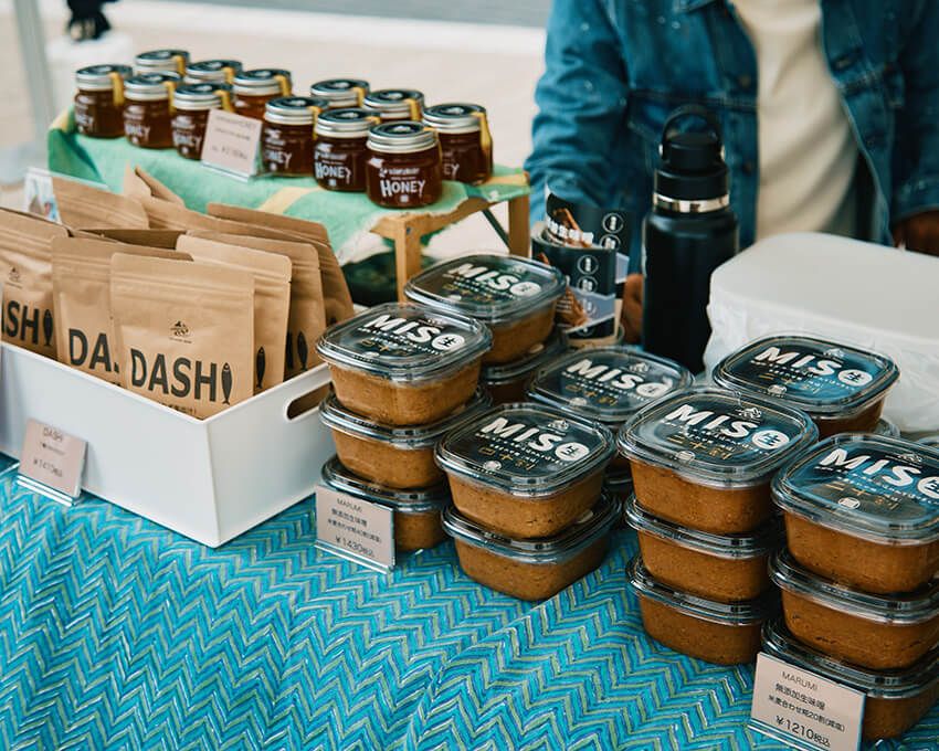 OCEANSでお馴染みのモデル・三浦理志さんは、自身がプロデュースする調味料ブランド「まるみ」を今年も出展。定番の無添加生味噌「MISO」に加え、7種の天然素材を使った無添加の出汁パック、そして収穫時期の異なる2種類のはちみつなどを販売した。