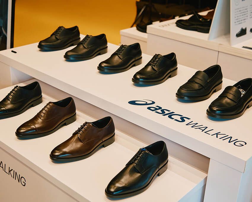 「アシックス ウォーキング」のブースでは、最新ビジネスシューズ「GEL-BIZ」を展示。スポーツシューズの知見を活かした衝撃緩衝材「fuzeGEL」を足裏全面に搭載し、長時間歩行の歩行でも快適な履き心地を実現する。