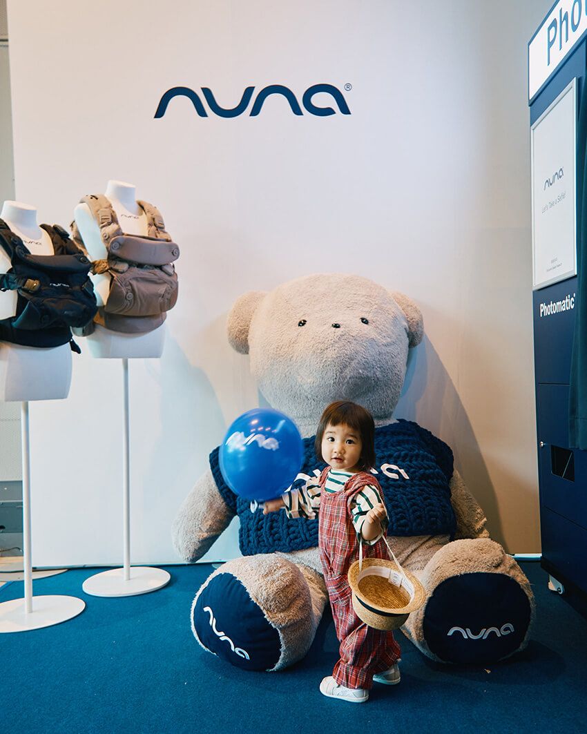 ホール内にも多彩なコンテンツが。オランダ発のベビーギアブランド「nuna」のブースは、来場者を出迎える特大サイズのテディベアが子供に大人気! 隣にはオリジナルデザインのフォトシートがプリントされるセルフフォト機が設置され、思い出の1枚を残そうと家族連れで賑わった。