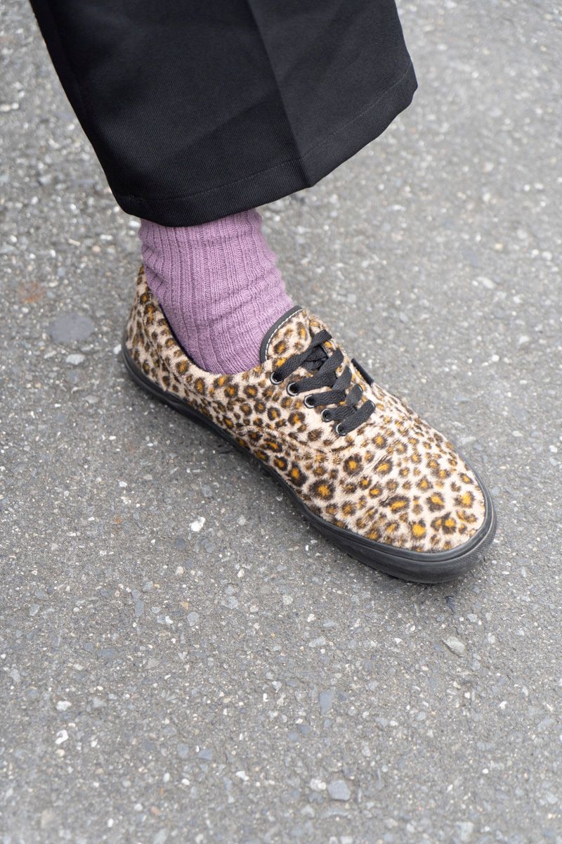 ベースがシンプルデザインだからこそ、派手なグラフィックでも気負いなく取り入れられるのがヴァンズのいいところ。チラッと覗いたときのペールパープルのソックスやダブルブリッジのアイウェア、腰のキーチェーンなど細部までこだわった。大胆かつ細やかな配慮の詰まった装いである。