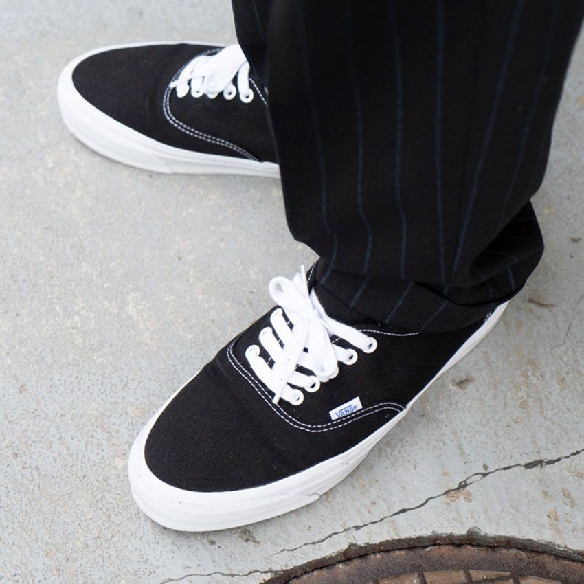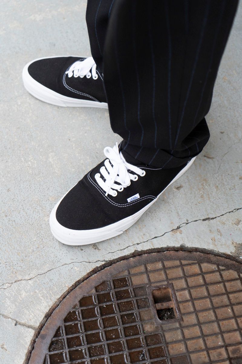 【写真12点】「スラックス×ヴァンズ、“シック&ストリート”な足元論」の詳細を写真でチェック① パッチワークの強烈デザインを黒スラックスで中和