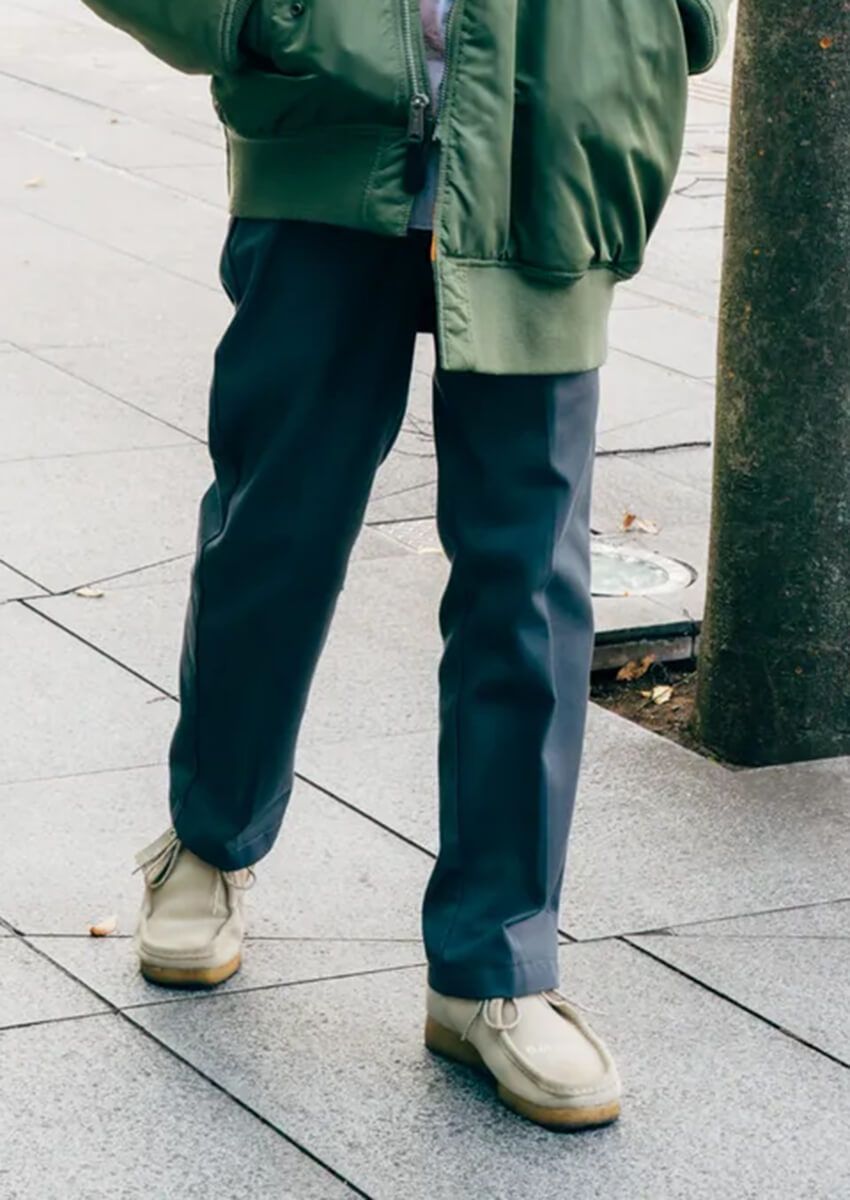 左右で着丈の長さが異なるモードなコラボレーションによるMA-1。その存在感を高めるのはシンプルな青シャツと細身のディッキーズだ。パリッとしたセンターに折り目の付く端正な印象の一本でしっかりとベースを固めた。