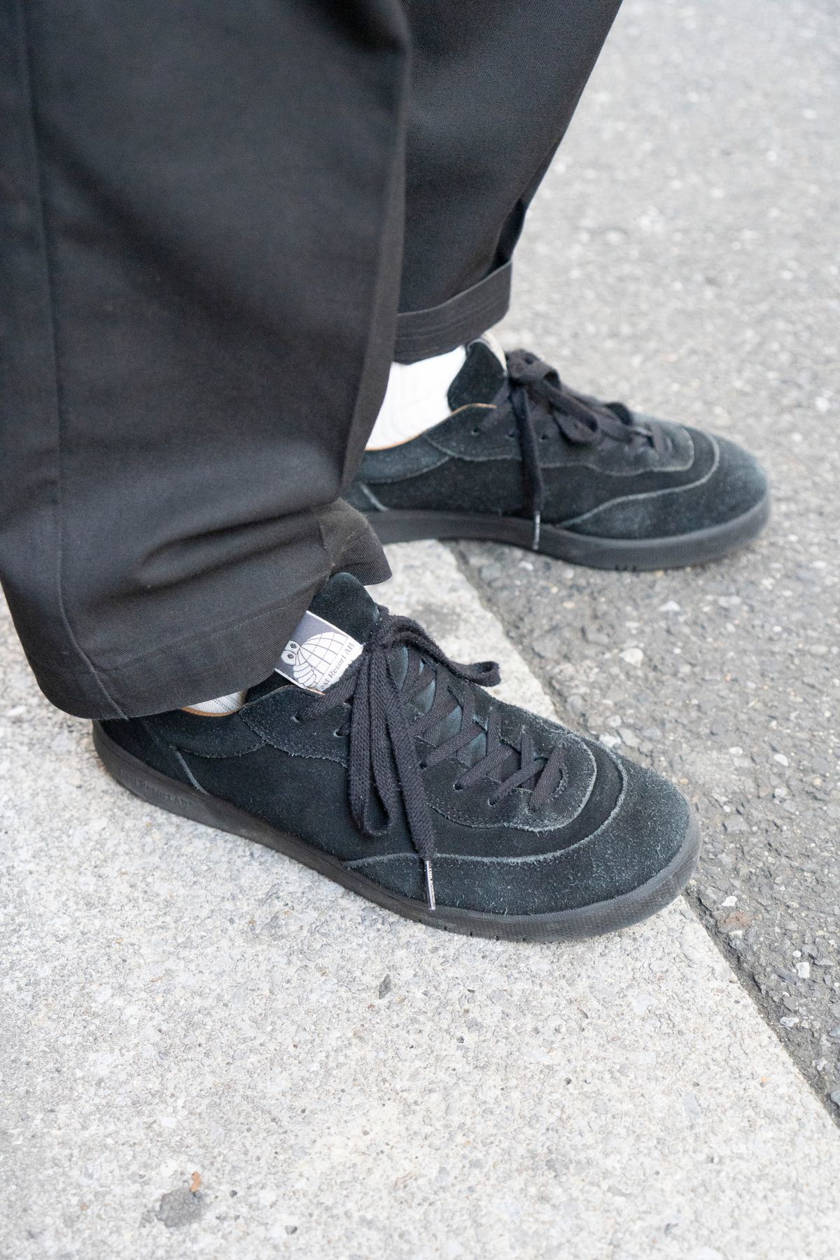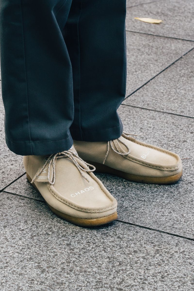 足元にもアクセント効果のあるコラボのワラビーブーツを合わせ、アイテム選びは定番ながら随所にアレンジを感じる装いに。遊び方が上手な御仁である。