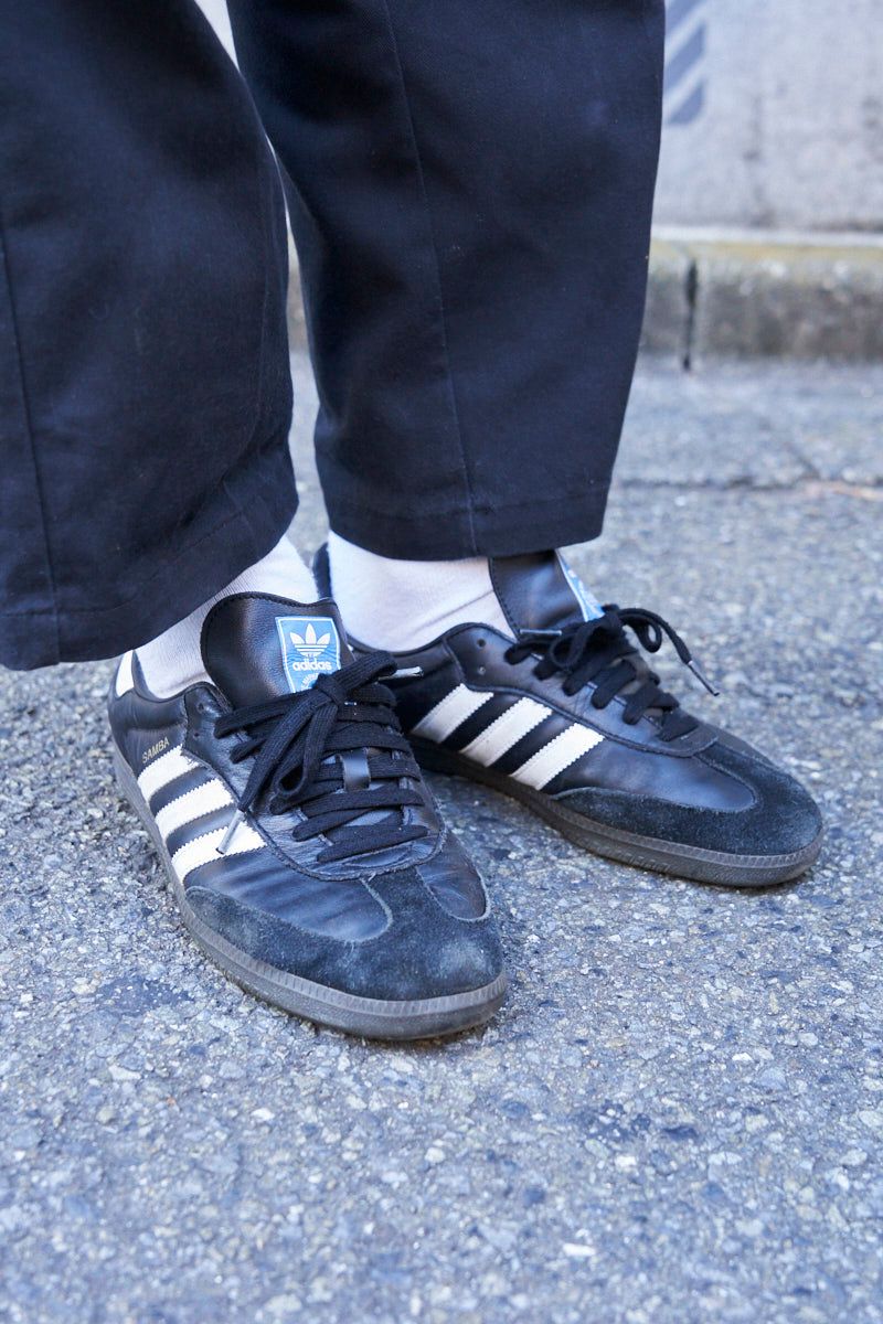 スウェット=パレススケートボード カットソー=ノーブランド パンツ=ディッキーズ シューズ=アディダス 帽子=キャプテンズヘルム 眼鏡=ゾフ バッグ=エビセンスケートボード