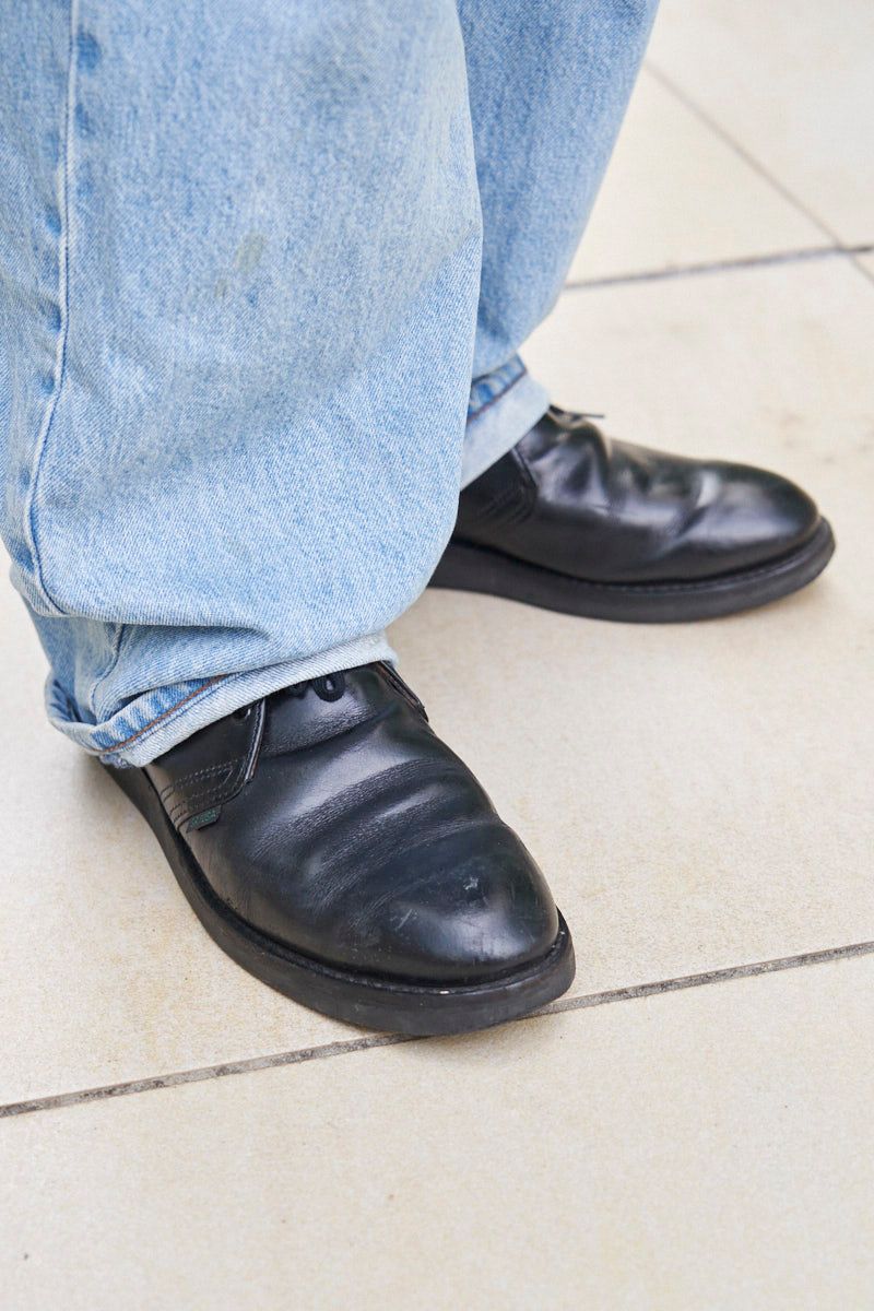 ▶︎村松さんのスナップをすべて見る松村龍基洋さん(41歳)ゆとりのあるサイジングで色はフラットに色落ちしたライトブルー。近年のデニムトレンドを押さえたボトムスに、「SR/USA」のタブが付いたレッドウィングのポストマンという定番をマッチアップ。
