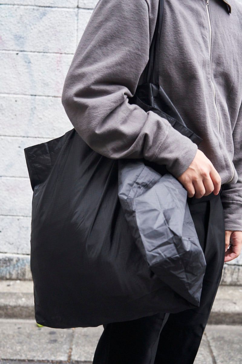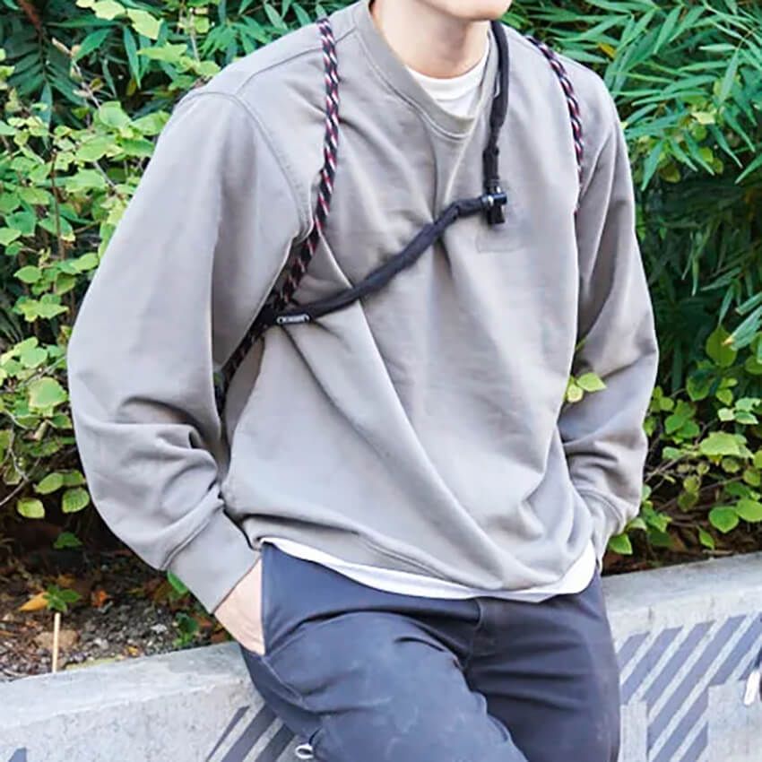 それでいて清潔感が感じられるのは、グレーという色味が力を発揮しているから。ナップサックのストラップのトリコロールカラーがさり気ないアクセントに。
