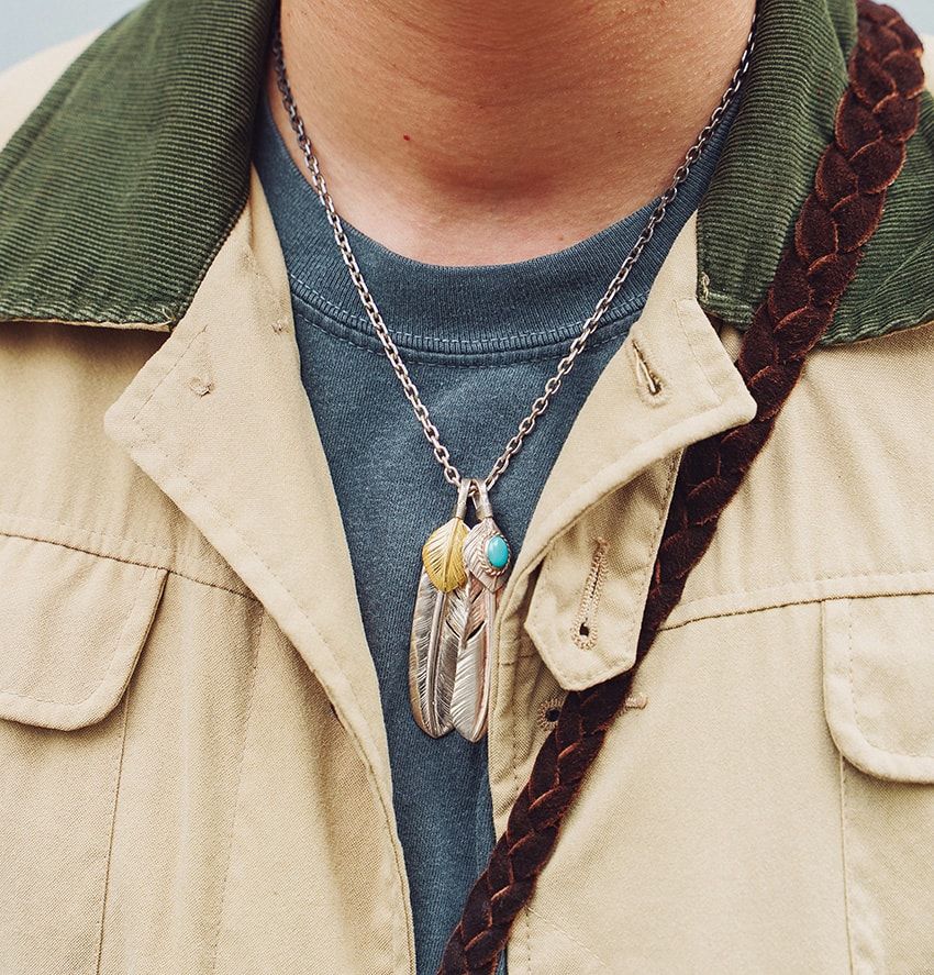 橡木雄一さん / 51歳スウェット、ワークパンツ&ブーツという軽装が物足りなく見えないのは、胸元のフェザーの重ね着けが主張しているから。