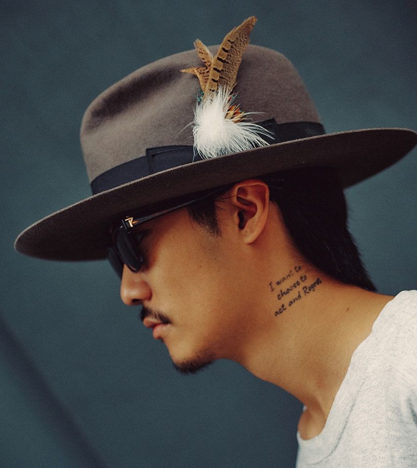 スウェット=古着 デニム=リーバイス ブーツ=ブランドストーン 帽子=ステットソン サングラス=ゾフ