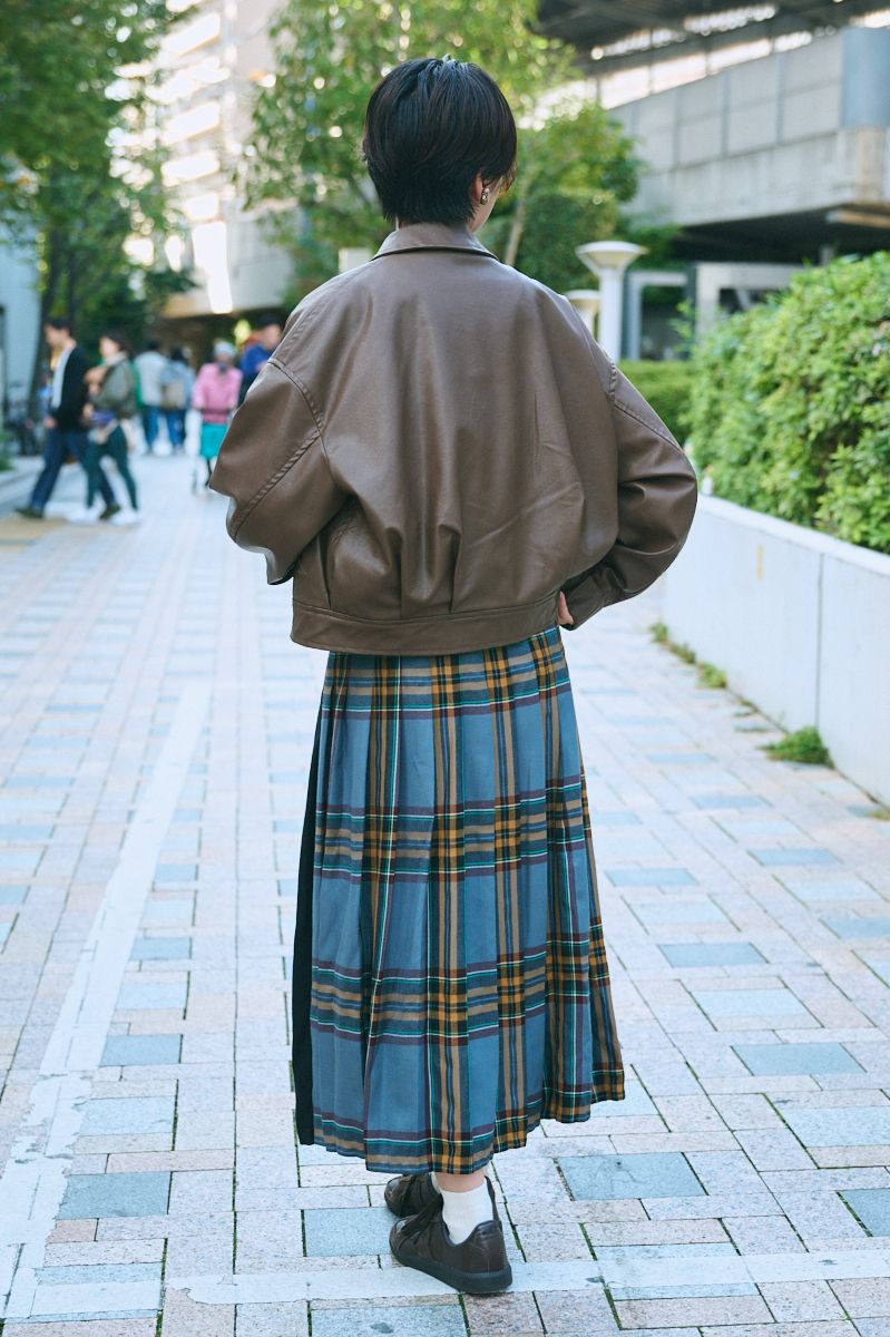 ▶︎ヒイさんのスナップをすべて見るヒイさん(23歳)ラストは女性の革ジャンスタイル。クレイジーパターンのロングスカートとモノトーンのブラウスに、短丈タイプのブルゾンをセット。見るからにクセになる甘辛である。