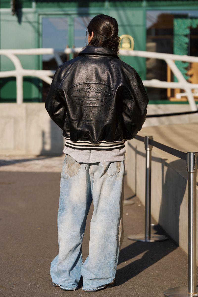 ▶︎秀平さんのスナップをすべて見る秀平さん(32歳)スーパーワイド&ダーティな個性派デニムを、まずはグレーのスウェットでナチュラルに。そして、レザーのスタジャンで武骨に装った。