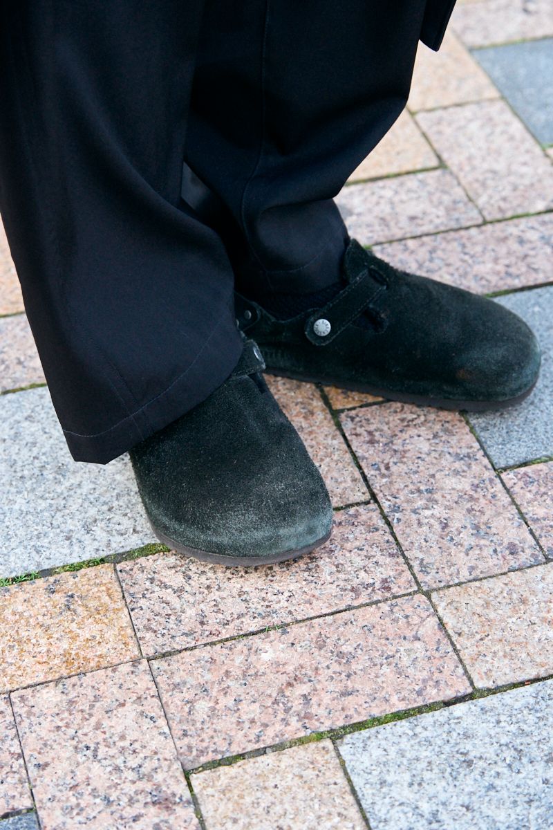 コート=ヨーク Tシャツ、ネックレス、ブレスレット、ブレスレット2、リング、リング2=すべてメゾンマルジェラ パンツ=アフターアワーズ シューズ=ビルケンシュトック 眼鏡=ジンズ ピアス=ノーブランド